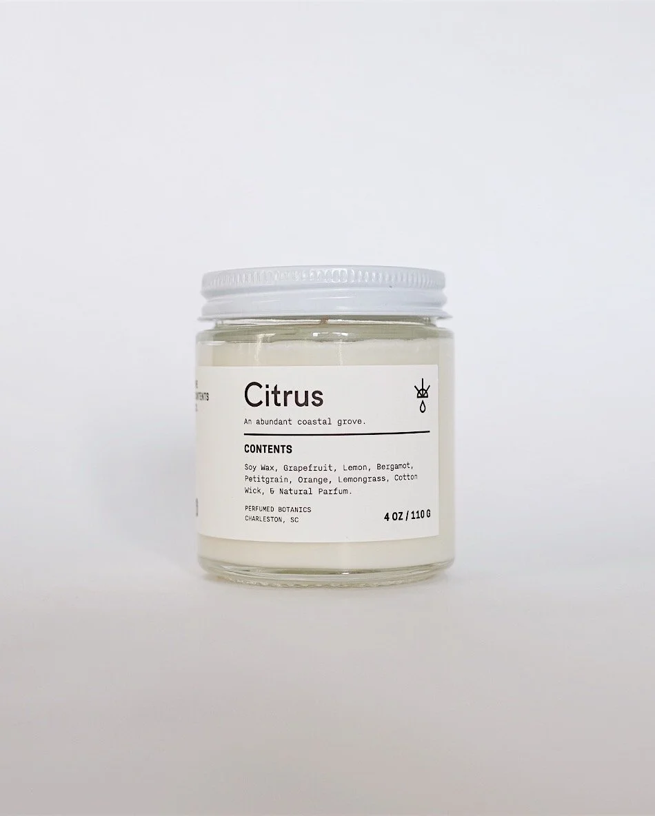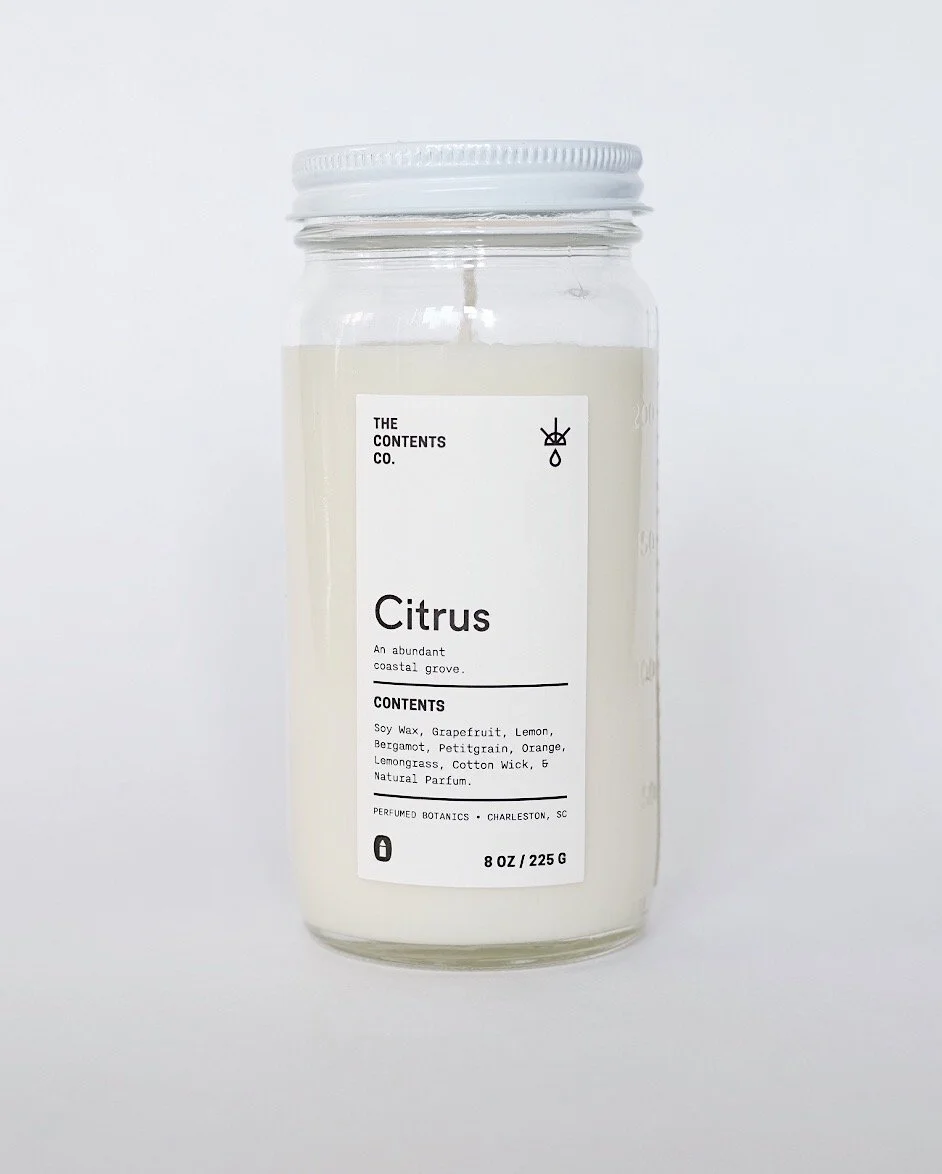 Soy wax, Grapefruit, Lemon, Bergamot, Petitgrain, Orange, Lemongrass, Cotton wick, and other Natural Oils, Absolutes, and Extracts (Natural Parfum)